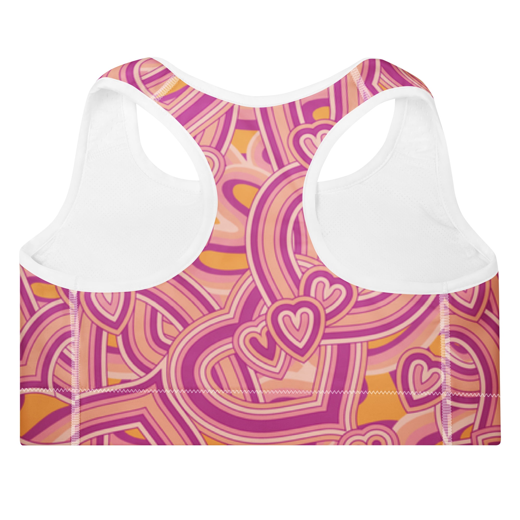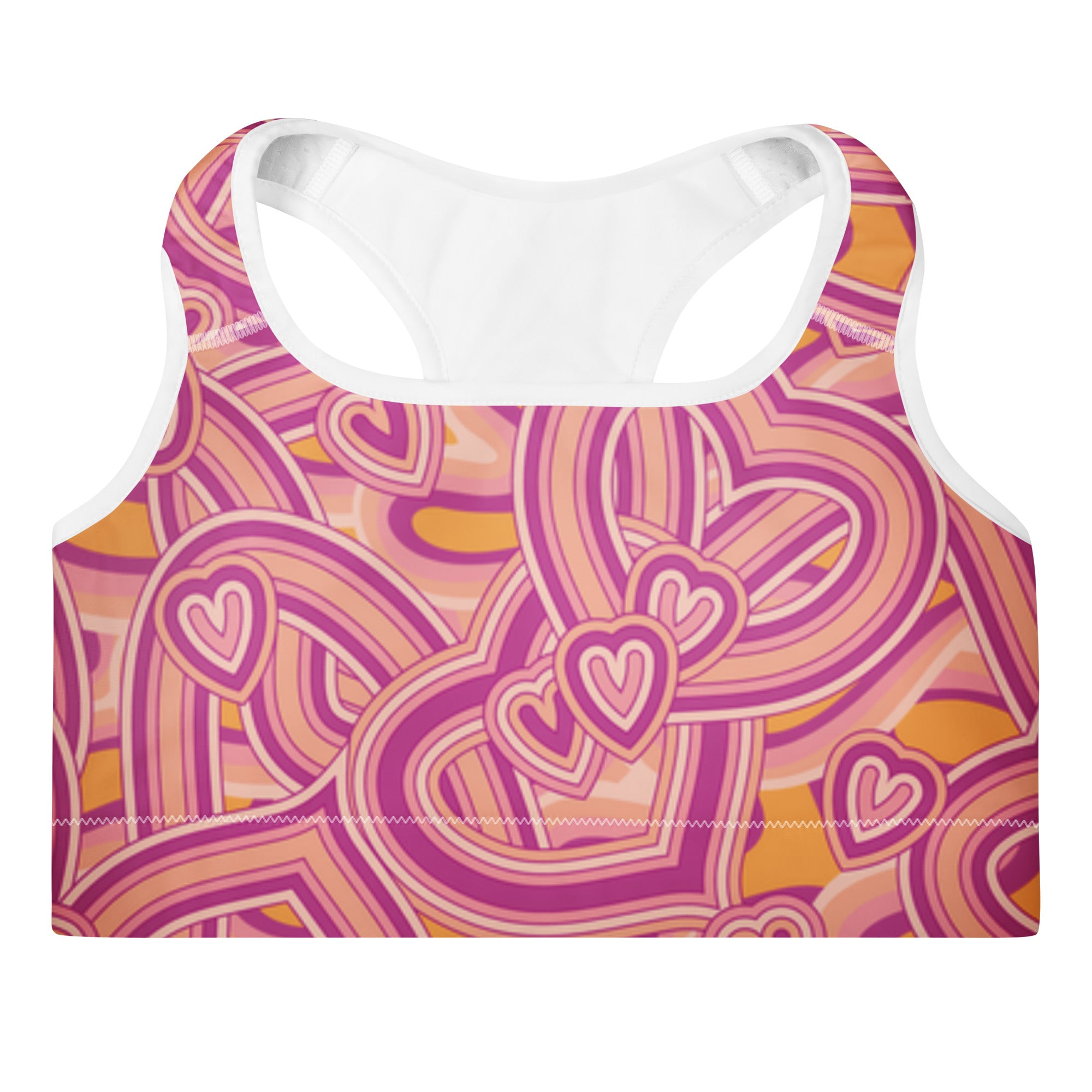 Style Meets Performance: Power through your toughest workouts with the Pink Retro Heart High-Support Sports Bra. This eye-catching piece features a bold, psychedelic heart pattern in pink, purple, and vibrant orange. Designed for medium to high-impact activities, the supportive racerback cut and wide under-bust band ensure maximum comfort and security while running, lifting, or dancing.