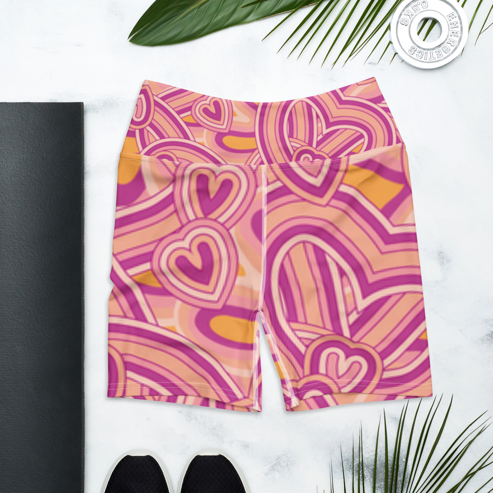 Groovy Vibe, Modern Comfort: Elevate your workout gear with our Retro Heart High-Waisted Biker Shorts. These shorts blend a vibrant, 70s psychedelic heart print in shades of bright pink and orange with high-performance, moisture-wicking fabric. The high-waisted design offers a flattering fit and reliable coverage for intense workouts, yoga sessions, or casual wear.