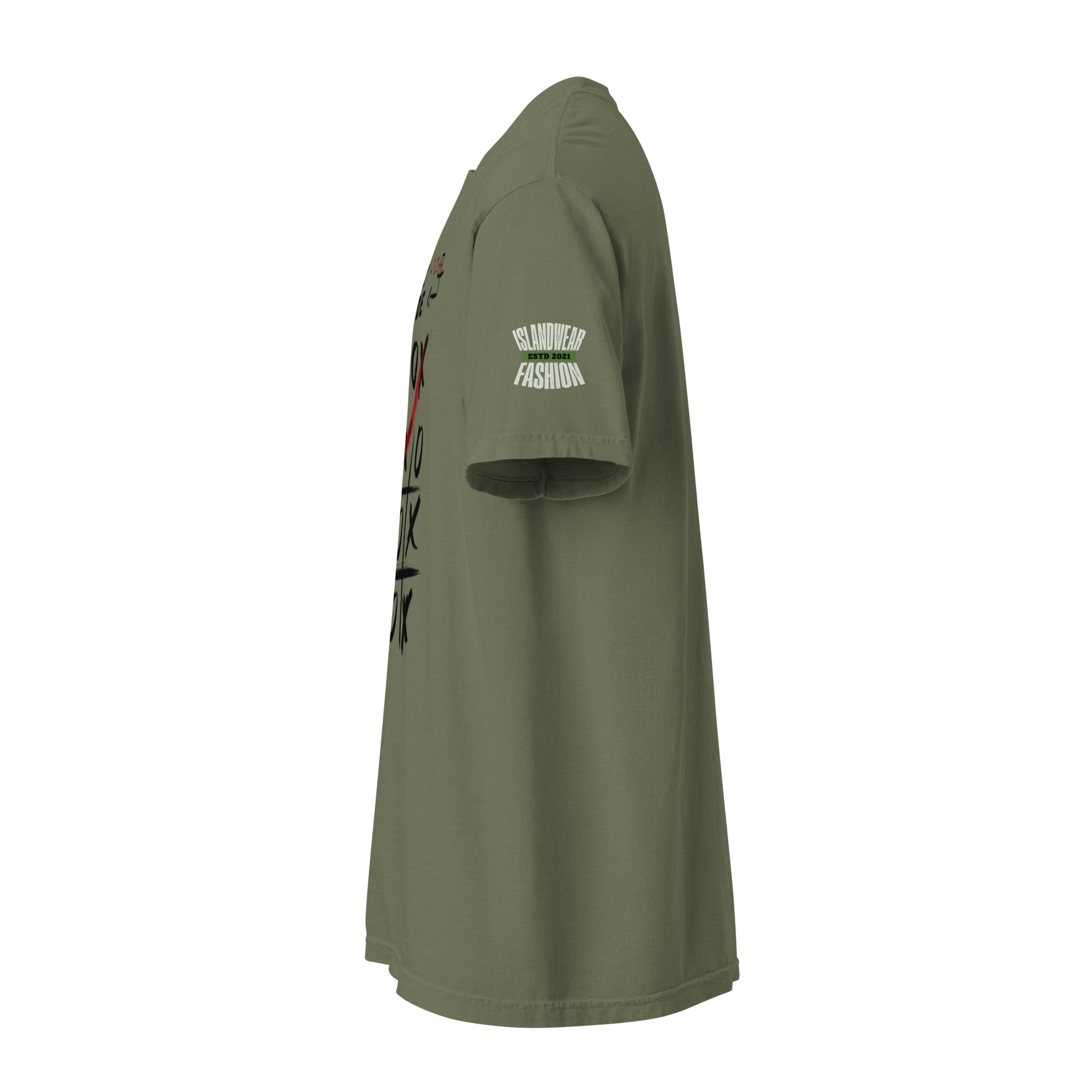 Printed on the fan-favorite Comfort Colors 1717 blank, this tee offers a vintage, lived-in feel from the very first wear. The muted sage green (khaki/olive) tone provides a perfect backdrop for the high-contrast black and red "graffiti-style" artwork.
