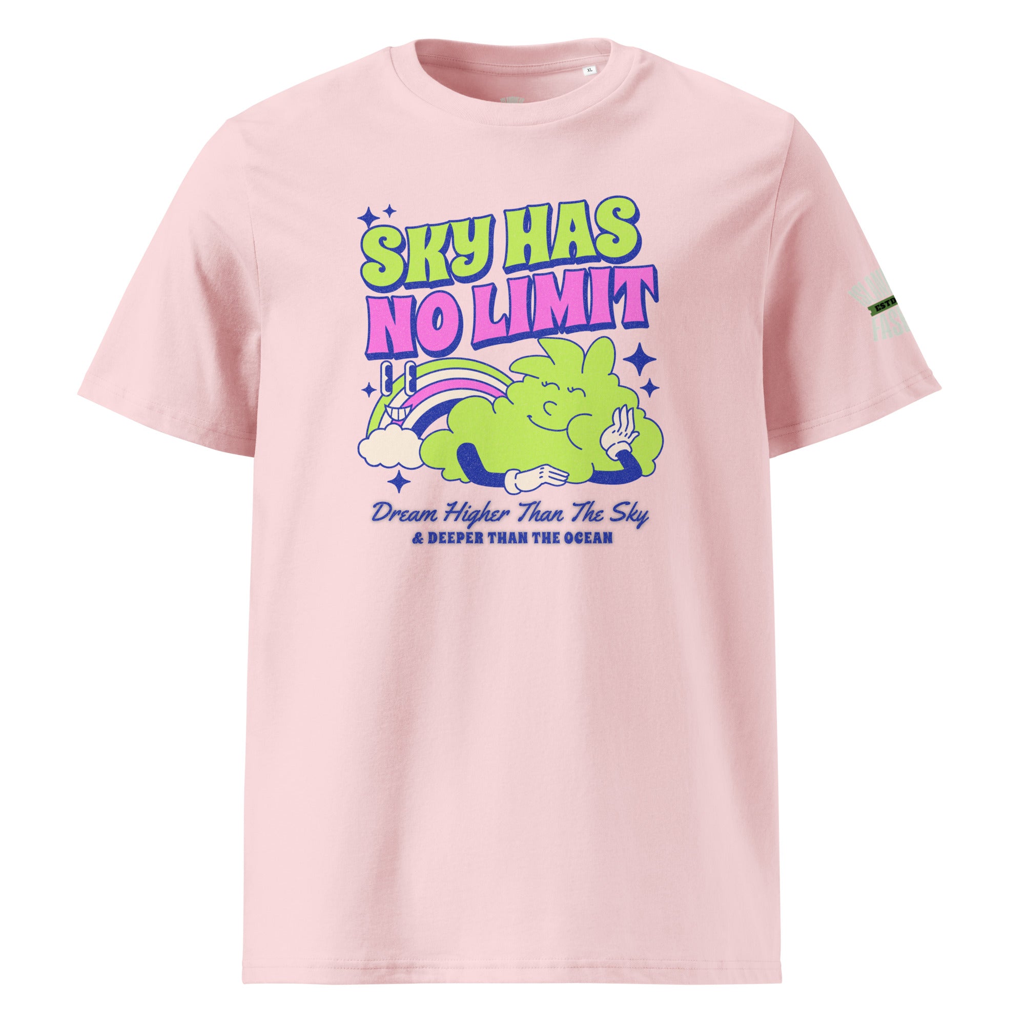 Elevate your wardrobe with the "Sky Has No Limit" Graphic T-Shirt. This pale pink tee features a vibrant, retro-inspired illustration of a relaxed green cloud resting against a rainbow backdrop. Combining a bold Y2K aesthetic with a positive message, it’s designed for those who believe in dreaming bigger than the sky.